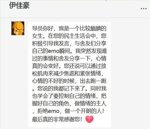 20电子商务本科2班的伊佳豪同学和翟浩冉同学,通过公司举行的宿舍民主生活会积极听取辅导员建议,与舍友分享调整好自身情绪,做情绪的主人,学会了如何认识情绪,了解不良情绪产生的原因,并且学会了运用多种调节情绪的方法改变消极情绪。