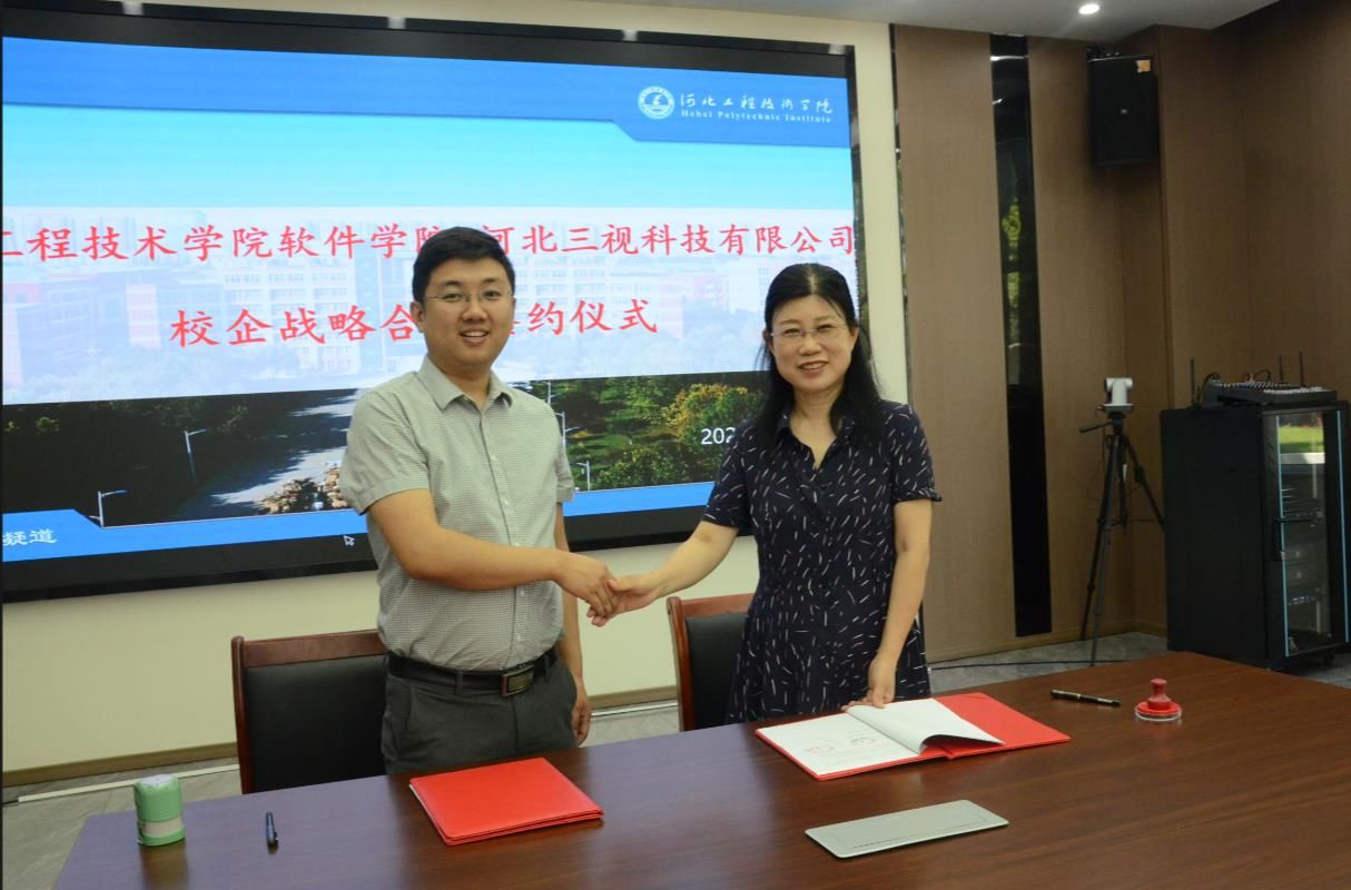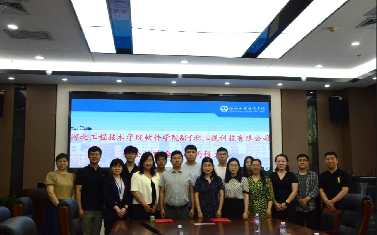 将项目引入校,为员工提供更多的实践机会一直是软件公司坚持的工作思路。学院一直将为员工积累实习、工作岗位和寻找合适的入校项目作为企业走访的目的。河北三视科技有限公司就是学院就业老师挖掘到的一家具有合作意向的企业。6月9日上午,三视科技总经理薛总带领公司技术骨干到校与公司签订校企战略合作协议。