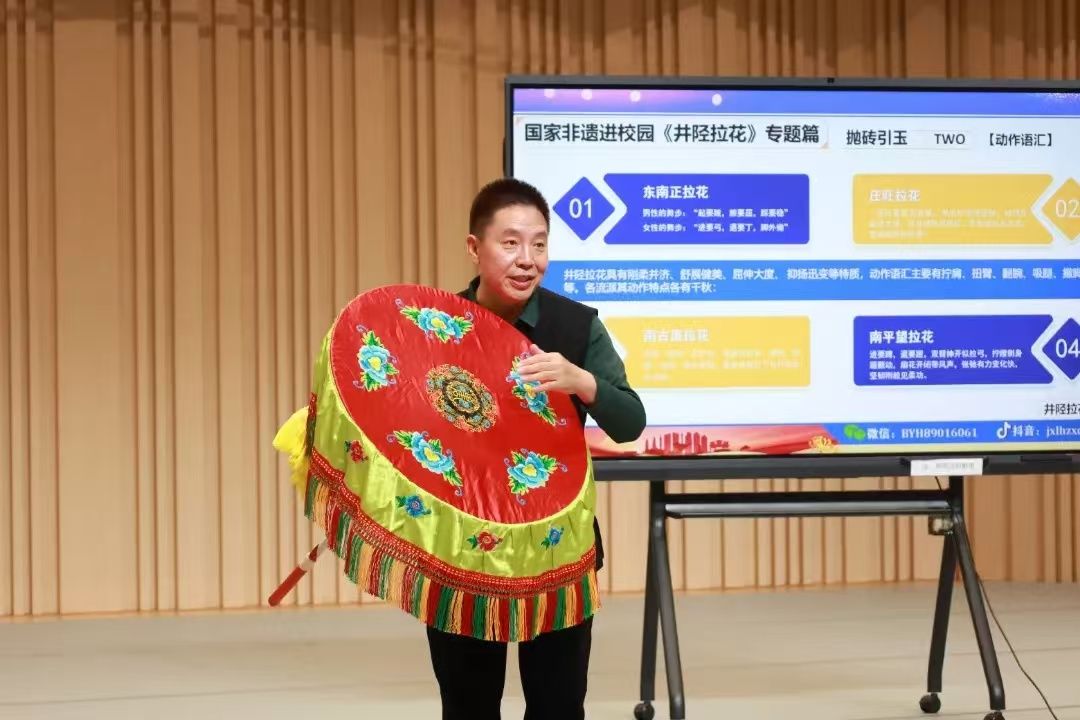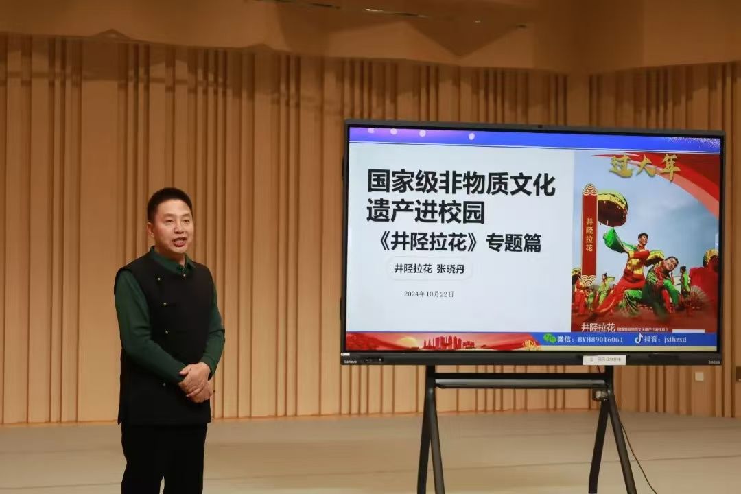 接下来,由国家级非物质文化遗产井陉拉花的传承者、拉花健身秧歌创始人张晓丹先生做《深度揭秘井陉拉花艺术之美》专题讲座。他深入浅出地阐述了井陉拉花的历史渊源,细致入微地剖析了其独特的艺术特色,并详细介绍了拉花的传承与创新。通过一系列生动的案例,张晓丹先生引领师生们走进井陉拉花的世界,让大家对这一传统艺术形式有了更加直观且深刻的认识。