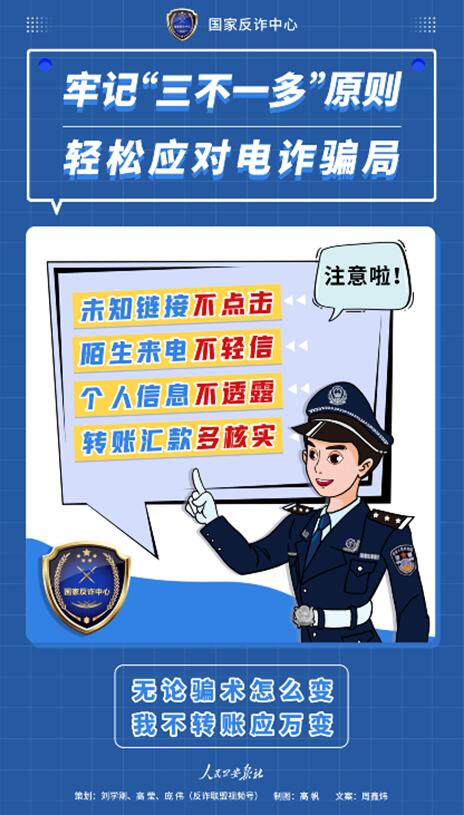 电信网络诈骗就是线上的非接触式诈骗,请大家牢记“三不一多”原则………….