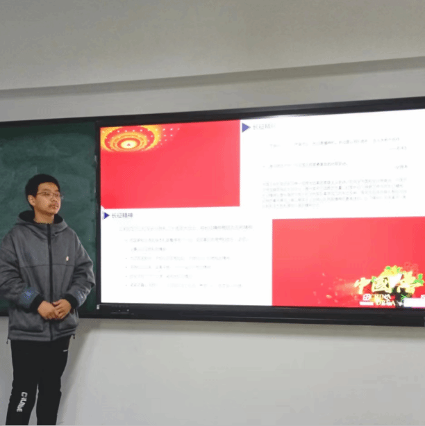 软件工程一班的范笑东同学介绍了长征的精神:雄关漫道,三军会师,体现出了伟大的长征精神,伟大长征精神,就是把全国人民和中华民族的根本利益看得高于一切,坚定革命的理想和信念,坚信正义事业必然胜利的精神;就是为了救国救民,不怕任何艰难险阻,不惜付出一切牺牲的精神;就是坚持独立自主、实事求是,一切从实际出发的精神;就是顾全大局、严守纪律、紧密团结的精神;就是紧紧依靠人民群众,同人民群众生死相依、患难与共、艰苦奋斗的精神。这种精神值得我们学习发扬。