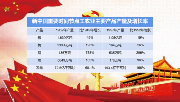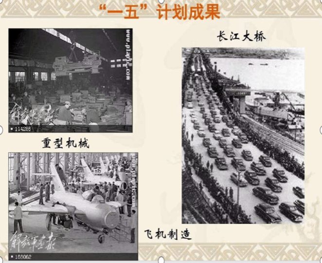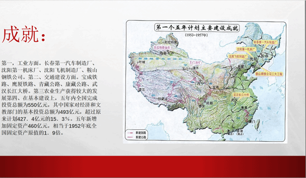经过新中国成立后三年的努力,我国基本实现了政治、经济、社会的稳定,为了准备进行有计划有准备的经济建设,我国从1951年开始着手编制第一个5年计划。1953年起,一面开始实施,一面继续完善。1953年6月14日至8月13日,中共中央召开全国财经工作会议,围绕贯彻执行过渡时期总路线,讨论修改第一个5年计划。1955年7月1届全国人大二次会议正式审议通过一五计划,较好的处理了我国经济建设中的几个重大关系,提出集中主要力量发展重工业同时不放松农业新工业,对国民经济各部门统筹兼顾,全面安排科学进行工业布局,改变我国工业大多集中在沿海地区的不平衡状况,根据我国国力积极稳妥确定工业农业生产年均增长速度,把发展生产改善人民生活恰当的结合起来,既要争取外援,同时又强调自力更生,国家建设应以国内力量为主,这些对于后来我国经济建设具有深远指导意义。在那个激情燃烧的年代,工人、农民、知识分子迸发出从未有过的热情,各条战线喜报频传。1953年底,鞍山钢铁公司大型轧钢厂等三大工程建成投产;1956年,第1辆汽车生产下线,第1架喷气式飞机试制成功,第1个机床制造厂建成投产;1957,年武汉长江大桥连通长江南北,川藏、青藏、新藏公路相继通车,限额以上的较大项目平均每天有一个开工或竣工。至1957年底,各项经济建设指标一般都大幅度超额完成,人民生活水平逐步提高。5年间工业生产取得的成就,远远超过旧中国的100年,新中国迅速从废墟上站起,为我国建立独立完整的工业体系奠定了基础,为社会主义建设积累了宝贵经验。