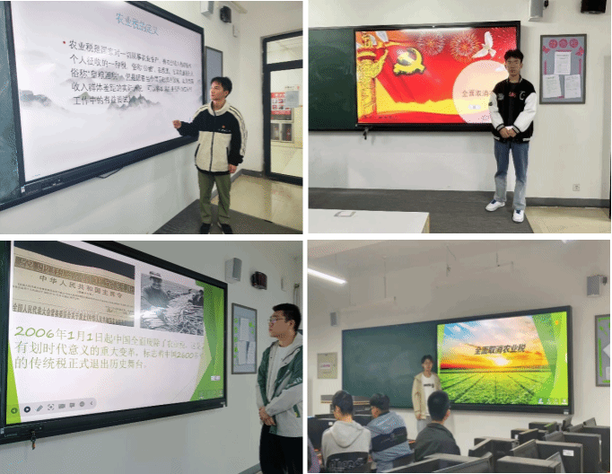 2022级软件工程5班的王宇诺同学讲到废除农业税条例,虽然只是“万里长征”的第一步,但毕竟已经迈出了这具有标志性意义的关键一步。废止农业税条例标志着中国农民的命运开启了一个不同以往任何历史时期的崭新阶段。软件工程6班的刘士达同学讲到了全面取消农业税的具体实践:2000年起从安徽开始,通过逐步扩大试点省份,到2003年在全国全面铺开。从2004年开始,改革进入深化阶段,取消了牧业税和除烟叶外的农业特产税;实行取消农业税试点并逐步扩大试点范围,推进乡镇机构改革、农村义务教育和县乡财政体制改革。吉林、黑龙江8个省份全部或部分免征了农业税,其他地方降低农业税税率一个百分点。2005年,全国有28个省份全面免征了农业税,河北、山东、云南也按中央要求将农业税税率降到2%以下。