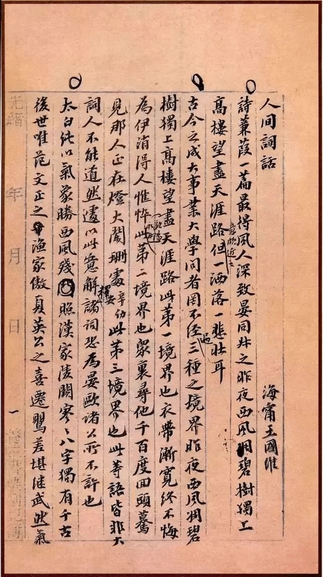 《人间词话》是一部被人们奉为古典文学批评里程碑式的作品。初读《人间词话》就让我沉浸于那精简却又华美的语句中,王国维不仅将其深厚的美学功底尽展其中,而且段段匠心独运。《人间词话》以小段形式呈现,甚至是只言片语,但其间不断流露出作者的睿智。诗文巨匠所创造的千古绝句与王国维的深刻见解穿过历史合二为一。那宛若天成的诗句加之王国维的唯美语句使《人间词话》散发出一股沁人心脾的幽香,平静了那些在喧嚣尘世中躁动的心灵,让那些被光明与黑暗折磨的筋疲力尽的人们找到了一处歇脚之地。