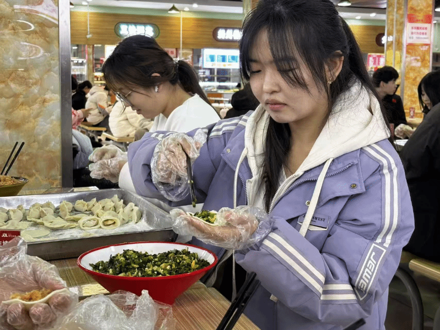 活动现场暖意融融,提前备好的饺子皮、玉米鲜肉馅料、韭菜鸡蛋馅料及相关工具已整齐摆放到位。同学们双手拉伸按压饺子皮,使面皮逐渐变得光滑筋道,大家舀取心仪馅料置于饺子皮中央,随后用手指沿皮边轻轻捏合,部分手法娴熟的同学还能快速捏出均匀的褶皱,确保饺子造型饱满、不易露馅。现场虽无过多喧哗,却充满专注有序而热闹非凡的氛围,同学们舀馅、填馅、压实的动作精准利落,默契配合,在互动交流中感受冬至节气的传统韵味与集体温暖,指尖的忙碌与食材的鲜香交织,尽显青春群体参与传统活动的活力与热忱,随后大家围坐在一起品尝自己亲手包的饺子,汤汁鲜香、面皮劲道,每一口都饱含着劳动的喜悦与集体的温暖。