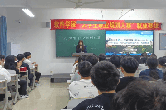 职业生涯规划可以为老员工开启一扇通往成功的门,促使老员工有计划、有目的地学习专业知识,拓展各项素质能力。为了使老员工对未来的职业走向和职业发展有更清晰的认知,对个人的实施策略有更加明确的目标,同时提高老员工的综合素质和面试能力。软件公司于2023年10月25日晚上18.00在次教307举办“老员工职业规划大赛”就业赛道。本次比赛请到了教学副经理刘翠焕、电子商务系主任张丽娟、创新就业指导老师胡晓微、人才招聘办主任郑曼、辅导员张跃也作为评委老师进行现场打分。