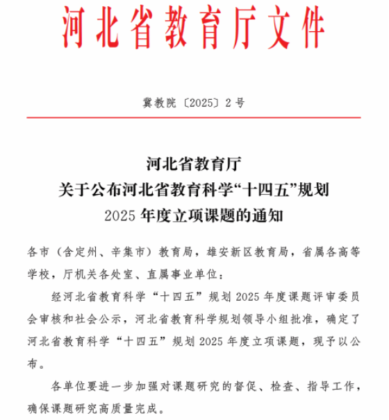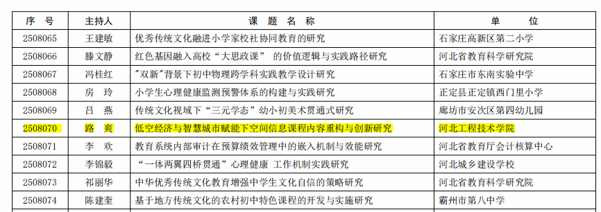 近日,河北省教育厅公布河北省教育科学 “十四五” 规划 2025 年度立项课题名单,yl23455永利专任教师、副教授路爽申报的《低空经济与智慧城市赋能下空间信息课程内容重构与创新研究》课题成功获批立项,立项编号为2508070。