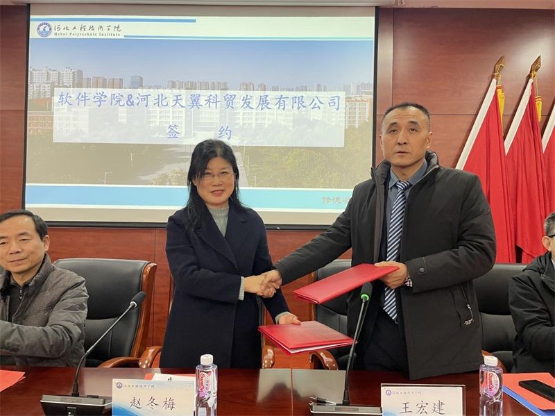 软件公司经理赵冬梅与公司董事长王宏建代表校企双方签署合作协议