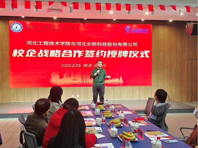 2022年2月23日上午,软件公司与河北长铄科技股份有限公司举行校企战略合作签约授牌仪式。出席签约授牌仪式的领导嘉宾有副董事长辛彦怀、对外合作部部长王俊昆,软件公司经理赵冬梅、执行经理胡丽莎、教学副经理刘翠焕、企业教师齐立双,河北长铄科技股份有限公司董事长毕长春、总经理陈子佳等。